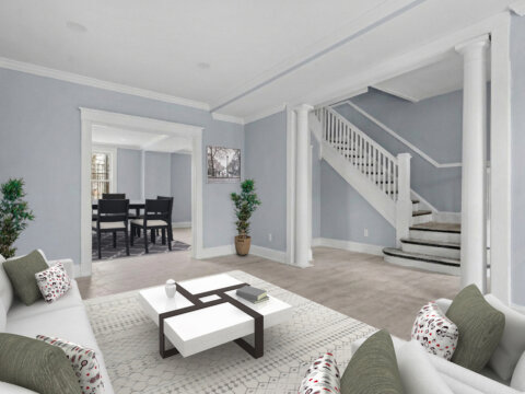 - ๐ช Restored historic staircase with elegant white columns