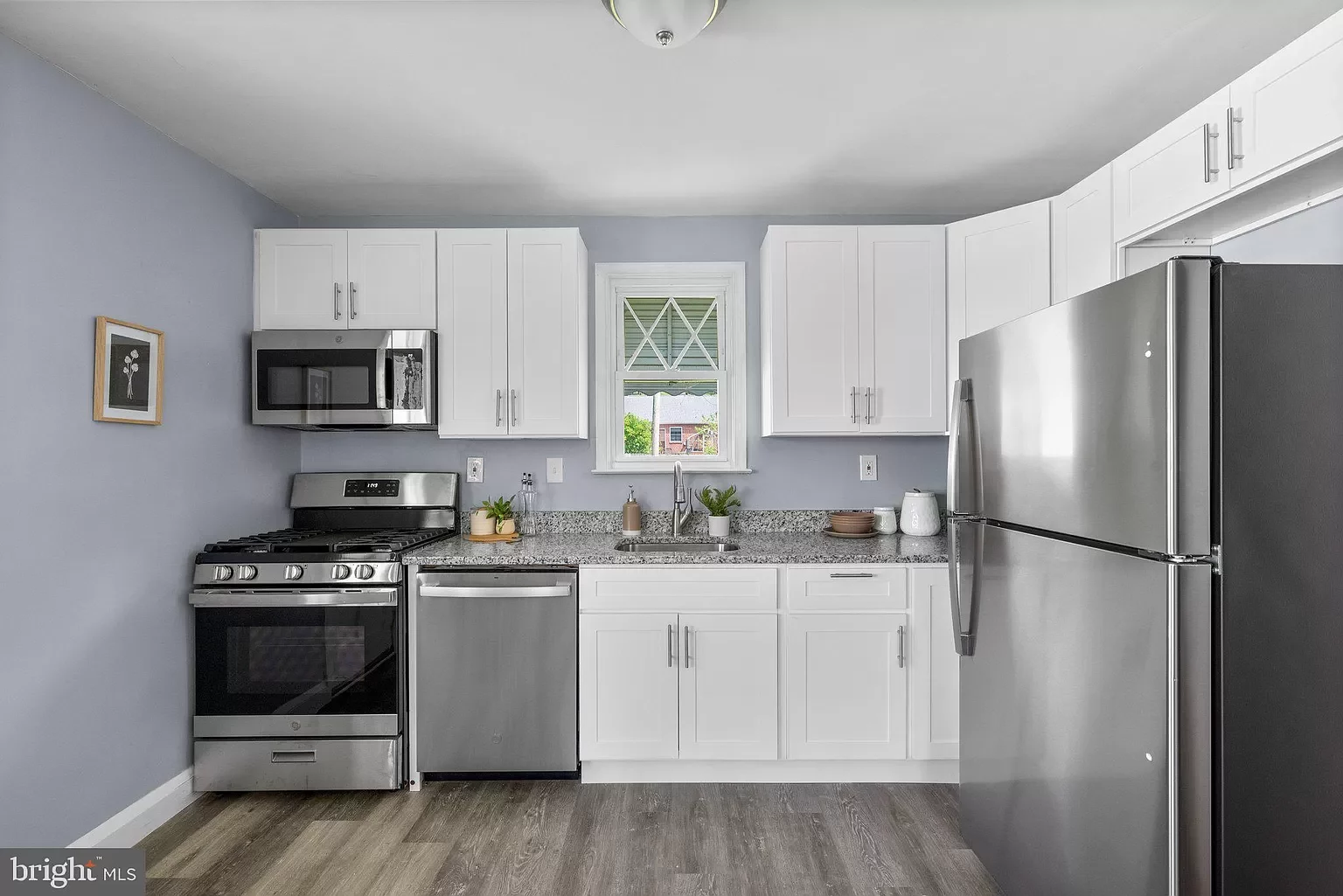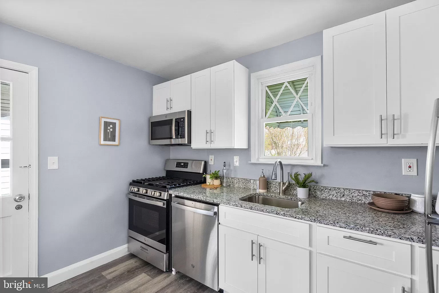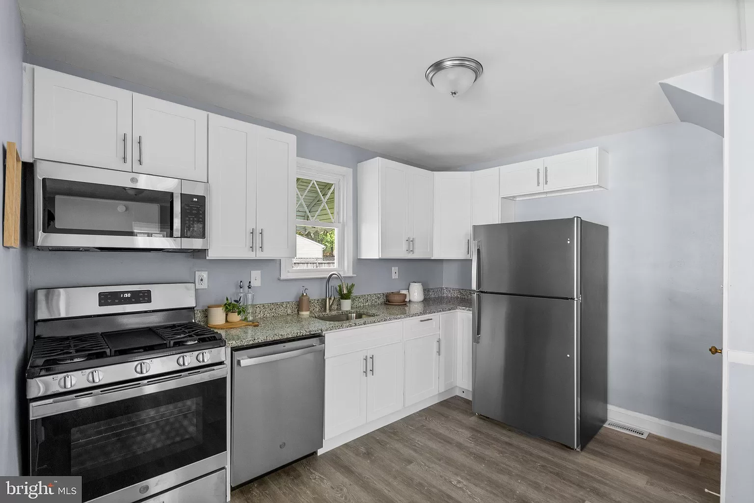-Granite countertops and new appliances in the kitchen.